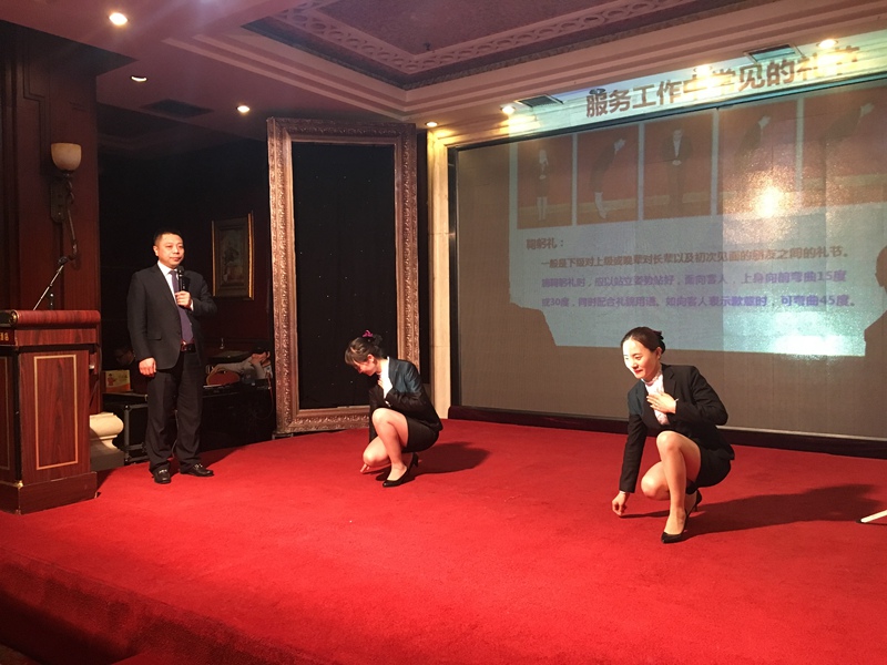 商務(wù)禮儀,通常指的是禮儀在商務(wù)行業(yè)之內(nèi)的具體運用,主要泛指商務(wù)人員在自己的工作崗位上所應(yīng)當(dāng)嚴(yán)格遵守的行為規(guī)范。學(xué)習(xí)商務(wù)禮儀除了有利于規(guī)范行為外,還有利于傳遞信息、增進(jìn)感情,以及樹立形象,是個人和企業(yè)發(fā)展不可或缺的重要素質(zhì)。此次培訓(xùn),馮總從儀表著裝、交往舉止、溝通禮儀、電話禮儀、會議禮儀等方面入手,不僅詳細(xì)講解了職場服裝、發(fā)飾、領(lǐng)帶、著裝搭配以及基本的商務(wù)禮儀規(guī)范,同時還與酒店的兩位工作人員共同現(xiàn)場演示了商務(wù)活動中的站、坐、走、拾物等基本規(guī)范要領(lǐng),以及服務(wù)人員接待客人時的問好、致歉、指引等動作標(biāo)準(zhǔn),使大家能夠更直觀、準(zhǔn)確的掌握基本商務(wù)禮儀。此外,馮總還結(jié)合自身多年酒店工作經(jīng)驗和外出學(xué)習(xí)經(jīng)驗,以視頻、案例、情景模擬等方式,將實際工作中會出現(xiàn)的問題及行為標(biāo)準(zhǔn)進(jìn)行了生動展示,有效提高了窗口單位人員的綜合素質(zhì)。