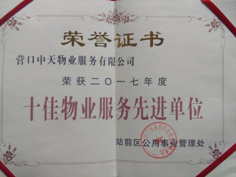 2月6日營口市站前區(qū)公用事業(yè)管理處召開2017年度表獎大會,會上授予中天物業(yè) “2017年度十佳物業(yè)服務先進單位”稱號。