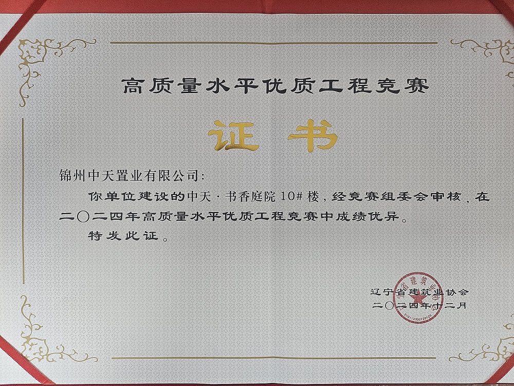 2024年12月,錦州中天·書香庭院一期項目6棟樓獲得省高質量水平優(yōu)質工程競賽獎,這樣一個振奮人心的消息,是對中天·書香庭院項目建設最好的肯定,同時也是對工程人無私付出的最好回報。遼寧省建筑業(yè)協(xié)會舉辦的高質量水平優(yōu)質工程競賽代表著建筑施工質量管理的領先水平,彰顯了中天在工程項目管理、工程品質、技術創(chuàng)新等領域的卓越實力。