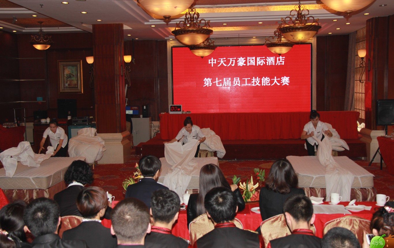 中天萬豪國際酒店一年一度的技能大賽,是檢驗酒店員工業(yè)務技能水平的一個平臺,是擇優(yōu)選拔技能高手的一次練兵,也是深入貫徹規(guī)范服務,全面提高員工業(yè)務技術水平及綜合技能的一項重要舉措。11月21日下午,中天萬豪國際酒店第七屆員工技能大賽在碩果累累的深秋拉開了帷幕,由餐飲部、客房部、前廳部、娛樂部、財務部、保安部和工程部選派的85名選手參加了比賽和技能演示。酒店總經理于洪波、副總經理高子洋、職業(yè)技術學校董娜老師、酒店副總經理高子洋出席了比賽現場,并擔任評委,酒店副總高子洋在賽前致辭。