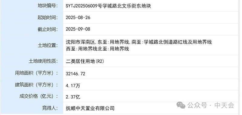 2025年9月8日,遼寧中天企業(yè)集團(tuán)旗下?lián)犴樦刑熘脴I(yè)有限公司以2.37億成功斬獲備受矚目的沈陽(yáng)市渾南區(qū)核心板塊長(zhǎng)青學(xué)城路北、文樂(lè)街東地塊,標(biāo)志著中天集團(tuán)成功進(jìn)軍沈陽(yáng)市,進(jìn)一步實(shí)現(xiàn)布局遼寧的戰(zhàn)略構(gòu)想,企業(yè)戰(zhàn)略發(fā)展版圖再擴(kuò)張。